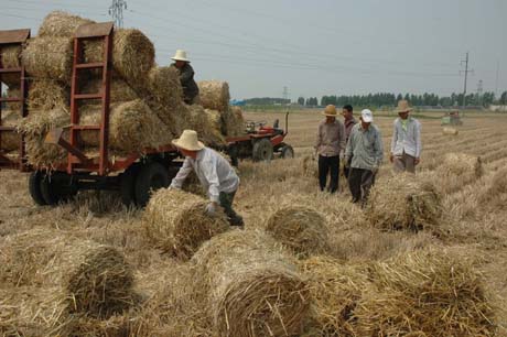6月2日,在河南省社旗縣城郊鄉(xiāng)柳營村,秸稈打捆作業(yè)隊(duì)將秸稈打捆回收。 為遏制焚燒秸稈,畜牧養(yǎng)殖大縣社旗縣組織數(shù)十臺(tái)秸稈打捆機(jī)械,活躍在田間地頭,將秸稈捆扎回收。秸稈可以成為牛羊飼料,變廢為寶。僅此一項(xiàng),每畝地可為農(nóng)民增收40余元。
