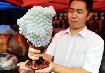7月10日,一名奇石收藏者在展示葡萄瑪瑙石。 當(dāng)日,第七屆中國(guó)·銀川賞石旅游節(jié)在銀川文化城開幕。來自內(nèi)蒙古、山東等地的眾多奇石收藏者展出上萬件材質(zhì)、形狀各異的奇石,讓參觀者大開眼界。
