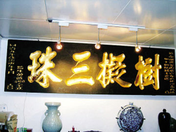 張松國(guó)還收藏有官匾、壽匾等不同類型的牌匾。他介紹,牌匾不僅是指示標(biāo)志,更是文化身份的標(biāo)志。歷史上它就廣泛應(yīng)用于宮殿、牌坊、寺廟、商號(hào)、民宅等建筑的顯赫位置,向人們傳達(dá)皇權(quán)、文化、人物、信仰、商業(yè)等信息。比如說(shuō)人們比較熟悉的商業(yè)領(lǐng)域的牌匾,它們往往是通過(guò)巧取文學(xué)作品、憑借商聯(lián)文采、援引成語(yǔ)典故、附著神話傳說(shuō)、名人題字等方式,抓住人們傳統(tǒng)的趨吉心理,以此來(lái)表達(dá)店家對(duì)客人的報(bào)恩情感,同時(shí)也顯示店家誠(chéng)信。一塊有分量的牌匾,能極大提升店家的整體形象。