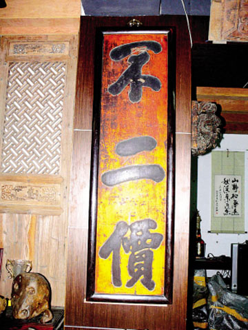 內(nèi)文是飽滿圓潤(rùn),柔中帶剛的三個(gè)字———“不二價(jià)”,匾的面上均勻分布金漆,匾身以名貴的紫檀木包邊,這塊明清時(shí)期紫檀邊框“不二價(jià)”匾是典型的古代商業(yè)牌匾。光從字面上理解,許多看過(guò)這塊匾的人都猜測(cè),過(guò)去是放在典當(dāng)鋪里作為鎮(zhèn)店之寶的。如今,這塊匾被藏家張松國(guó)所得。當(dāng)初他在一條古玩街上看到這塊老匾的時(shí)候,一眼就看出了材質(zhì)上的不凡之處,等店老板開(kāi)了價(jià)便二話不說(shuō)買走了。此后還多方面查找資料尋找出這塊老匾的來(lái)歷,目前已有一些眉目需要進(jìn)一步的證實(shí)。這塊老匾,仔細(xì)摸會(huì)發(fā)現(xiàn)匾身內(nèi)里似乎夾有東西,估計(jì)是紙張文書(shū)一類,如果取出來(lái)看必定大有發(fā)現(xiàn)。但是,考慮到貿(mào)然動(dòng)手,會(huì)損壞老匾的整體外觀,所以就沒(méi)有刻意在其身上尋找證據(jù)。