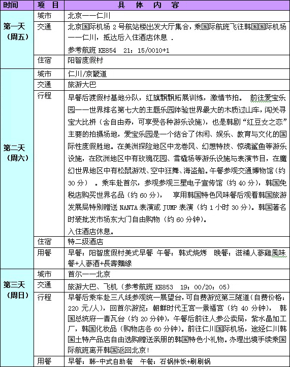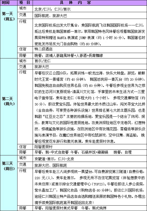 行程報價:2980元/人,憑華聲在線王建五的博客優(yōu)惠券(http://wangjianwu.blog.voc.com.cn)每人可優(yōu)惠300元,售價僅為2680元/人。 費用包含以下內(nèi)容:韓國全程特二級酒店以上標準或韓式渡假村/房間2人1間/1日3餐/全程華語導游;包含國際及境外交通費/全程機場稅/第一景點門票/簽證費/旅行社責任險;全程活動拓展組織費。