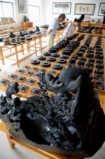 著名硯臺(tái)收藏家、江西婺源縣黃源龍尾硯雕刻廠廠長錢文斌,自幼喜愛硯臺(tái)收藏與創(chuàng)作,30年來收藏了上千件唐、宋、元、明、清等時(shí)期的歙硯、端硯、乳硯、松花硯及苴卻硯,尤其以歙硯為最全,他還在家中建起集萃軒龍尾歙硯藝術(shù)館,讓更多的人能欣賞到這些寶貝,感受中國古文化的獨(dú)特魅力。 歙硯作為中國四大名硯之一,距今有1200多年的歷史,因產(chǎn)于唐宋時(shí)期的安徽歙州而得名。 游客正在參觀他的集萃軒龍尾歙硯藝術(shù)館。