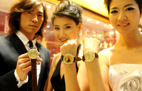 8月28日,在北京菜百商場,模特展示熊貓金幣紀念表。當日,由上海金幣投資有限公司發(fā)行的一款熊貓金幣紀念表(限量收藏版)在北京上市。據(jù)介紹,該款手表表盤由3克成色為99.9%的純金壓印而成,上面有“中華人民共和國成立六十周年紀念”字樣和天安門浮雕圖案等。表背透明,鑲嵌一枚2009版1/20盎司熊貓金幣。熊貓金幣紀念表在全國限量發(fā)行6000只。