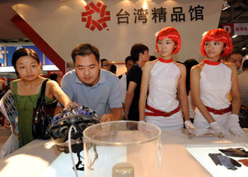 9月9日,正在福建廈門舉行的第十三屆中國國際投資貿易洽談會上,觀眾在臺灣精品館觀看臺灣制造的富有創(chuàng)意的自行車帽。新華社記者:張國俊