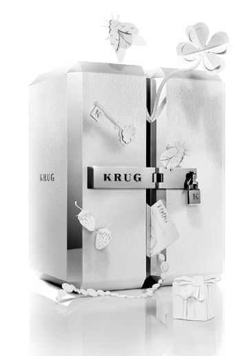 毫不費(fèi)勁地打開鎖扣,閃耀的內(nèi)部設(shè)計(jì)與剛毅簡潔的外包裝形成強(qiáng)烈反差:傾斜裝置的鏡面令整個(gè)盒子散發(fā)出迷人的光澤,同時(shí)讓陳列其間的庫克陳年香檳(KrugGrandeCuvée)以及兩只刻有品牌標(biāo)識(shí)的香檳杯越發(fā)明艷耀眼。
