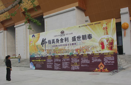 為了迎接新中國六十華誕,祈福和諧盛世,以“和韻中國”為主題的法門寺首屆佛文化藝術(shù)展9月29日至10月30日舉辦。薈萃了千余件中國佛文化藝術(shù)領(lǐng)域頂級水準(zhǔn)的磚雕、繪畫、琉璃、瓷器、唐卡等珍品,分屬于法門寺地宮珍寶藝術(shù)展、首次面世的法門寺舍利真身寶塔磚雕藝術(shù)、琉璃藝術(shù)家楊惠姍20年琉璃佛像展和佛教陶瓷藝術(shù)展等專題中。包括“香云寶爐”、柴窯粉青浮雕描金象耳爐等禮器在內(nèi)的這些最具代表性、最能體現(xiàn)佛教文化特色的古今藝術(shù)珍品,大部分是首次在中國大陸展出,本次國家級別的展出規(guī)格也無先例。有20多萬人海內(nèi)外游客云集佛教圣地法門寺,盛況空前。評論認(rèn)為,法門寺佛文化藝術(shù)展預(yù)示著一次源于東方的佛教文化世界之旅正式啟航。
