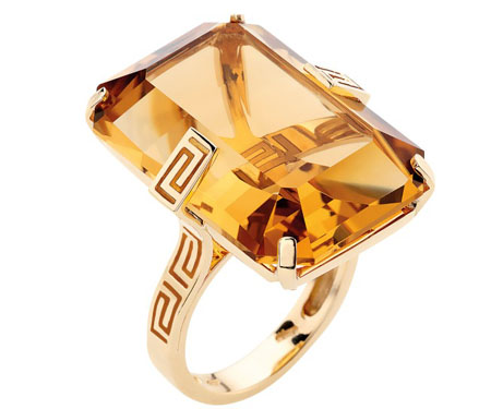 ▲范思哲的DAFNE指環(huán)系列采用了紅金、黃金及白金等不同材質,綴飾深色紫晶及灼爍石英。寶石的琢面獨特而耀目,配合以精工細造的希臘萬字圖案,成就了完美的鏤嵌效果。