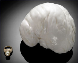 英國(guó)寶龍拍賣(mài)公司定于12月月6日在美國(guó)洛杉磯拍賣(mài)一顆重達(dá)2.25公斤的天然珍珠。據(jù)信這是世界上已發(fā)現(xiàn)的第二大珍珠。 寶龍拍賣(mài)公司在聲明中說(shuō),這顆形狀像人腦樣的珍珠直徑達(dá)15厘米,發(fā)現(xiàn)于菲律賓巴拉望島附近水域,被稱(chēng)為“巴拉望公主”,據(jù)信重量?jī)H次于重約6.35公斤的另一顆珍珠。 這顆珍珠估價(jià)在30萬(wàn)到40萬(wàn)美元之間。歐洲寶石實(shí)驗(yàn)室參與了它的鑒定工作。這家實(shí)驗(yàn)室的寶石學(xué)家米奇·賈科博維奇說(shuō):“這是我們見(jiàn)過(guò)的最大珍珠之一,人們一生只有一次機(jī)會(huì)看這種自然界獨(dú)特的珍寶。” 拍賣(mài)會(huì)將在洛杉磯自然歷史博物館舉行,與這顆珍珠一起拍賣(mài)的還有孕育它的蚌殼的下半部分。