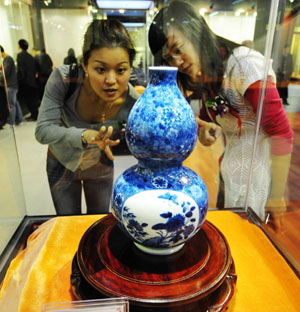 兩名觀眾在欣賞民間籌建的泉州至正藝術(shù)博物館收藏的清咸豐年間古瓷器青花葫蘆瓶。