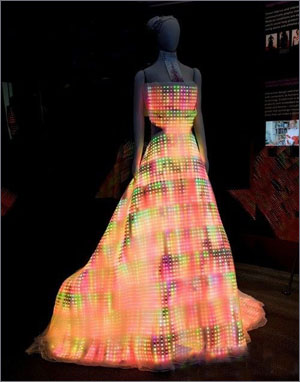 uteCircuit)公司設(shè)計(jì)師弗蘭切絲卡·羅塞利亞和瑞安·根茨受美國(guó)芝加哥科學(xué)和工業(yè)博物館委托,設(shè)計(jì)一件代表時(shí)尚創(chuàng)新的服裝,于是催生了這件嵌有2.4萬(wàn)個(gè)發(fā)光二極管的晚禮服。 它有一個(gè)貼切的名稱——銀河晚禮服。 該款晚禮服雖然綴滿發(fā)光二極管,卻不笨重:每個(gè)發(fā)光二極管都像紙一樣薄,長(zhǎng)2毫米。連接二極管的電路設(shè)計(jì)得尤其輕薄,手工縫制在一層絲綢上,以便伸展。 設(shè)計(jì)師說,發(fā)光二極管應(yīng)用的新技術(shù)不會(huì)使裙子溫度過高,想穿“銀河晚禮服”的超級(jí)時(shí)尚迷們不會(huì)感覺炙熱。另外,發(fā)光二極管耗能低,裝在襯裙里的小充電電池足夠點(diǎn)亮它們。