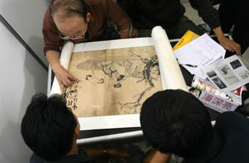 裝裱作偽也是關(guān)系到一幅造假字畫成敗之關(guān)鍵。 一幅臨摹的贗品字畫弄好后蓋上假章提上假款,就開始進(jìn)入最后一道程序,就是對(duì)字畫進(jìn)行“做舊”裝裱處理。在內(nèi)地某仿古字畫街上,筆者親眼目睹了裝裱字畫的全過程。 他們所使用的紙張作偽原理也很簡(jiǎn)單,即用煙熏、吸潮、茶葉水、促霉等方法使成品表面讓人在觀看、鼻聞、手摸時(shí)都能產(chǎn)生古舊的感覺,把偽作保存在放了很多樟腦丸的樟木箱內(nèi)數(shù)日就成。 之后再把成品故意做成十分破損,有的在字畫后面還涂上一些黃泥狀物,給人的感覺就像是拆舊房時(shí)從墻上取下來的,有的上面還有很多像針尖一樣的“蟲眼”,讓人一眼看去,這幅字畫就是很久很久以前從前幾輩人那里留傳下來的“古董字畫”。如本人購(gòu)得一幅齊白石的“蝦”,就是如此裝裱造假的。 這里的造假不背人。老板說,假造的程度你看著達(dá)到滿意為止,哪點(diǎn)兒不像,繼續(xù)加工運(yùn)作,直到買方滿意為止。另外,還有大批量的瓷器、青銅器造假也是當(dāng)著眾人的面明目張膽地進(jìn)行。正如老板所言,“我們?cè)旒俚玫降睦麧?rùn)很薄,只要有利就賣,一幅偽作只要能從中賺個(gè)10元、8元就可以了,所以每天全國(guó)各地的文物販子都會(huì)光臨我們這仿古一條街! 字畫造假的手段還有許多。奉勸那些真正喜愛字畫的收藏投資者,不妨多到外邊走走看看,這樣既可開闊眼界,提高鑒賞的水平,又能做到防止上當(dāng)受騙,從而減少每每交了“學(xué)費(fèi)”后悔不已的心情。 |