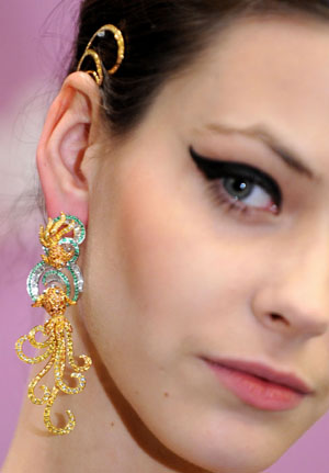 日前,香港貿易發(fā)展局在香港會議展覽中心舉行新聞發(fā)布會,公布第十一屆香港珠寶設計比賽結果。本屆香港珠寶設計比賽以“珠寶無限”為主題,分為公開組和學生組,評選出工藝技術獎、公開組(戒指)大獎、公開組(耳環(huán))大獎、公開組(胸針)大獎以及學生組的冠亞季軍等共七個獎項,獲獎作品將于3月5日至9日舉行的第27屆香港國際珠寶展上展出。圖為模特在展示獲得公開組(耳環(huán))大獎的耳環(huán)——“韻”。