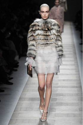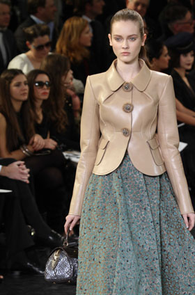 路易威登這一季舉起復古大旗,“閃回”過去,再現上世紀50年代女性的風姿。 由著名設計師馬克·雅各布斯主理的路易威登2010—2011秋冬時裝以連衣長裙為主。各式花色裙裝均采用收腰設計,而裙擺處則采用開放式設計,仿佛一朵朵鮮花在模特身上綻放。此外,設計師在長裙上身部分的精心設計,突出了女性的豐滿、盈潤。 箱包是路易威登秀臺上永遠不可缺少的配飾。一款款精致手包恰到好處地為一套套服飾增加色彩,無形之中也深化了品牌形象。