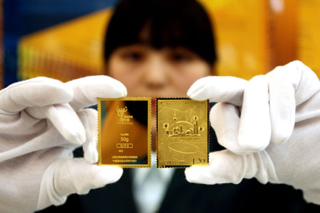 為紀念中國2010年上海世博會開幕,中國郵政發(fā)行《中國2010年上海世博會開幕紀念》郵票一套一枚,日前,中國集郵總公司以開幕郵票圖案特別制作發(fā)行《〈中國2010年上海世博會開幕紀念〉郵票金磚》一組三款。這是繼中國郵政發(fā)行《〈開國大典〉郵票金磚》及《〈庚寅年〉郵票金磚》之后第三組編號限量發(fā)行的郵票金磚。