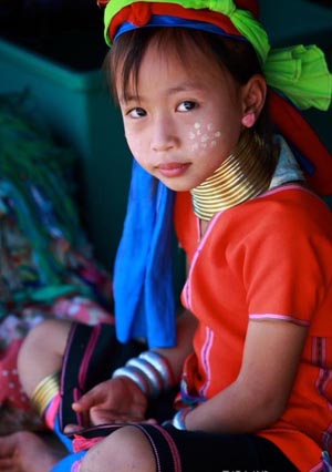 戴銅項圈的習(xí)俗在卡倫族已有數(shù)百年之久,而這種習(xí)俗的起因由于沒有文字記載,所以眾說紛紜。在無數(shù)的傳說中,我更傾向女性戴項圈是為了炫耀家庭財富的說法。這種獨特的傳統(tǒng)的確讓人驚訝,也讓人好奇。對長頸族來說,這是美麗的象征。但我想每次換項圈時,她們看到自己頸項上黑色的壓痕,會不會覺得這是一種傷害呢?