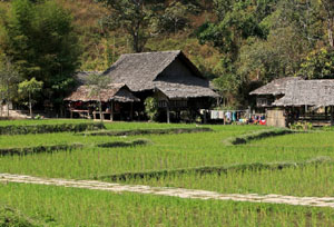 “長頸村”坐落在山澗之間,簡陋的茅屋是人們的棲身之所,門前屋后秧苗翠綠。巴掌大的民族村內(nèi)不僅居住著長頸族,還有其他的族群如阿卡族、拉扈族、大耳族、苗族等等,目前約有200多人。