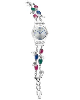 斯沃琪月光寶石·浪漫名媛淑女腕表(LadyMaona)的表鏈繼承了斯沃琪Bjioux的色彩和繁花圖案,采用拋光不銹鋼316L制造,由略呈拱形的橢圓團花構(gòu)成,飾以彩色半透明合成樹脂。橢圓團花與優(yōu)美的花卉吊飾從鏈條上垂掛而下,通往透明的塑料表殼。優(yōu)雅的設(shè)計凸顯了腕表的精致與名媛氣質(zhì)。