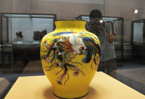 7月23日,《南北兩院珍藏日本瓷器精品特展》在長(zhǎng)春偽滿皇宮博物院正式開展。展覽共展出了由長(zhǎng)春偽滿皇宮博物院和廈門華僑博物院收藏的110多件日本精品瓷器。展覽將一直持續(xù)到9月中旬。圖為一位參觀者在為“日本黃地彩鳳凰七寶燒壺”拍照。