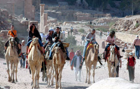 10月26日,在距約旦首都安曼約260公里的旅游名勝佩特拉,游人興致勃勃地騎著駱駝游覽。為讓游客體驗古羅馬時期的風(fēng)情,佩特拉景區(qū)為游客提供了馬車、駱駝、毛驢等作為代步工具。