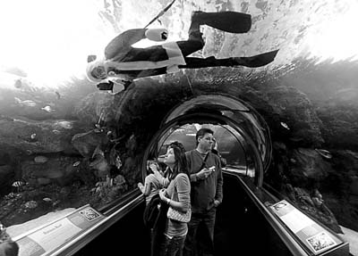 23日,在美國明尼蘇達州布盧明頓的一個購物中心水族館,身穿圣誕老人服裝的湯姆·哈格隆德(上)在水中向游客問好。這已經(jīng)是哈格隆德第四年裝扮成“水下圣誕老人”向來此游覽購物的市民問好。