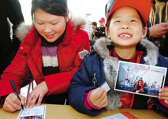 昨天(11日),許多即將踏上火車回家的民工兄弟姐妹走上采血車,參加了“美麗心靈——以無償獻血的名義”真情互動活動。市獻血辦請人為他們拍照并當(dāng)場打印出來。圖中這名在上海打拼了多年的江蘇籍于女士獻完血后,在和女兒的合影照上寫下一句感言——“希望上海更美好”。