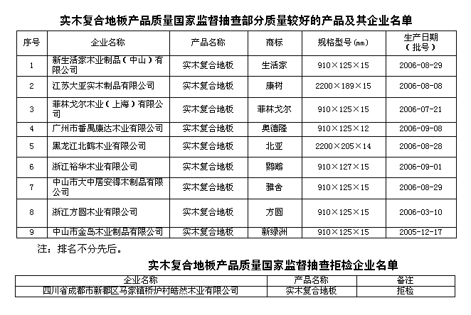 抽查結(jié)果表明,實木復(fù)合地板產(chǎn)品整體質(zhì)量水平較好,尤其是大型企業(yè)的產(chǎn)品質(zhì)量保持穩(wěn)定,連續(xù)兩年的國家監(jiān)督抽查合格率均為100%。