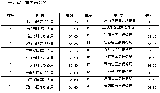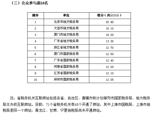 為加強稅務(wù)機關(guān)互聯(lián)網(wǎng)站建設(shè),國家稅務(wù)總局委托第三方評測機構(gòu)(中國軟件評測中心),按照《國家稅務(wù)總局辦公廳關(guān)于開展省稅務(wù)機關(guān)互聯(lián)網(wǎng)站評估的通知》(國稅辦函[2007]161號)的要求,分政務(wù)公開、在線辦事、公眾參與、網(wǎng)站管理4個部分設(shè)定指標(biāo)體系,以網(wǎng)上采樣的方式對各省、自治區(qū)、直轄市和計劃單列市國家稅務(wù)局、地方稅務(wù)局主辦的互聯(lián)網(wǎng)站進行了客觀評估,現(xiàn)將評估結(jié)果公布如下: