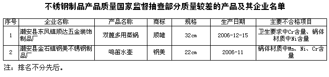 為維護消費者的合法權(quán)益,促進不銹鋼制品行業(yè)健康發(fā)展,國家質(zhì)檢總局組織對不銹鋼制品產(chǎn)品質(zhì)量進行了國家監(jiān)督抽查,共抽查了廣東、福建、浙江、上海等4個省、直轄市30家企業(yè)生產(chǎn)的30種不銹鋼制品,其中不銹鋼器皿28種,不銹鋼餐具2種,產(chǎn)品抽樣合格率為83.3%。