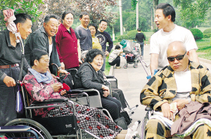 5月8日,湖南籍保姆鐘國順(右)在浙江溫州松臺廣場推著輪椅陪雇主散心。在溫州,像鐘國順一樣的男保姆越來越多,他們主要承擔洗衣、燒飯、擦地板、照顧老人和病人等工作。據(jù)家政市場人員介紹,男保姆的月工資在1500元至2000元之間,比女保姆高出許多。據(jù)《浙江日報》
