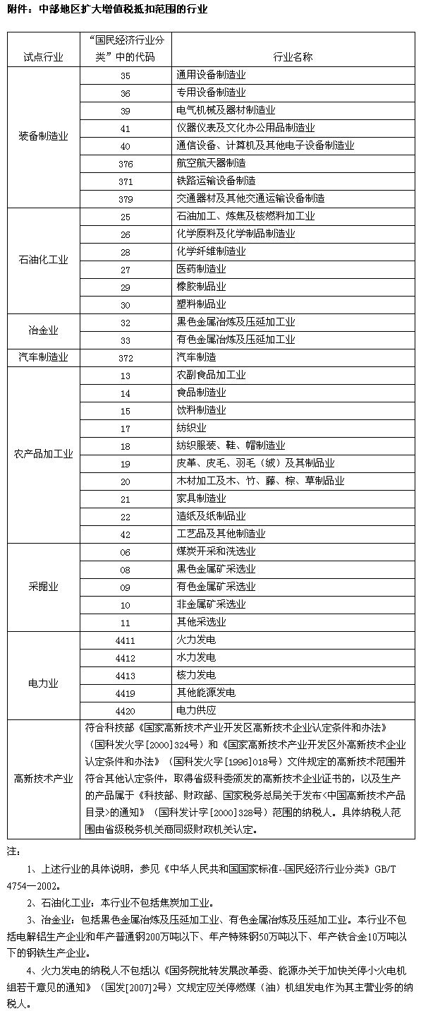 根據(jù)《中共中央國(guó)務(wù)院關(guān)于促進(jìn)中部地區(qū)崛起的若干意見(jiàn)》(中發(fā)[2006]10號(hào))在中部地區(qū)實(shí)行增值稅轉(zhuǎn)型的精神和《國(guó)務(wù)院辦公廳關(guān)于中部六省比照實(shí)施振興東北地區(qū)等老工業(yè)基地和西部大開(kāi)發(fā)有關(guān)政策范圍的通知》(國(guó)辦函[2007]2號(hào))確定的范圍,財(cái)政部、國(guó)家稅務(wù)總局制定了《中部地區(qū)擴(kuò)大增值稅抵扣范圍暫行辦法》,現(xiàn)印發(fā)給你們,請(qǐng)遵照?qǐng)?zhí)行。