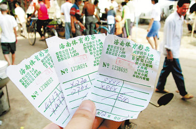 6月12日,在海南省定安縣解放路上,“私彩”攤販出售彩票。該縣最繁華的解放路及附近農(nóng)貿(mào)市場(chǎng),聚集了幾十家“私彩”攤販。“私彩”泛濫屢禁不絕,其中一個(gè)重要原因是當(dāng)?shù)貙?duì)“私彩”打擊的行政管理仍然缺位。