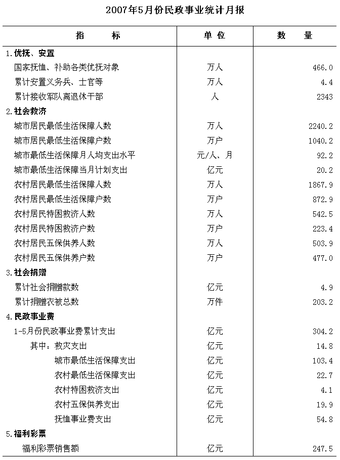 民政部公布五月份民政事業(yè)統(tǒng)計數(shù)據(jù)