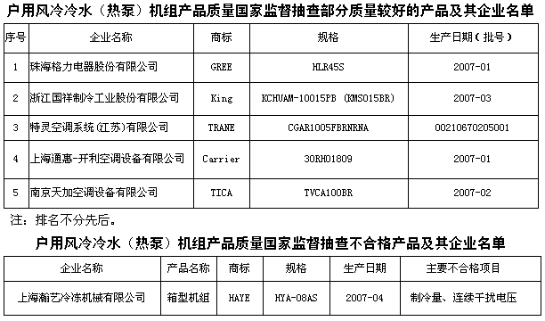 通用要求》、GB19577-2004《冷水機組能效限定值及能源效率等級》等強制性國家標準及相關(guān)產(chǎn)品標準的要求,對戶用風冷冷水(熱泵)機組產(chǎn)品的名義工況制冷量、名義工況制熱量、制冷性能系數(shù)、噪聲、泄露電流、電氣強度、接地電阻、連續(xù)干擾電壓以及標志、包裝等10個項目進行了檢驗。 抽查結(jié)果表明,市場占有率較高的大、中型企業(yè)的產(chǎn)品質(zhì)量較好,產(chǎn)品抽樣合格率為100%。而個別小型生產(chǎn)企業(yè)的產(chǎn)品質(zhì)量存在問題。 抽查中發(fā)現(xiàn)的主要質(zhì)量問題: 1、個別產(chǎn)品制冷量不合格。戶用風冷冷水(熱泵)機組制冷量是表達冷水機組從水中帶走的熱量,是冷水機組的一個基本參數(shù)。推薦性國家標準GB/T18430.2-2001《蒸汽壓縮循環(huán)冷水熱泵機組戶用和類似用途的冷水(熱泵)機組》規(guī)定,戶用風冷冷水(熱泵)機組的制冷量要大于等于銘牌值的95%。抽查中有個別產(chǎn)品制冷量達不到標準規(guī)定的要求。 2、個別產(chǎn)品連續(xù)干擾電壓不合格。強制性國家標準GB4343.1-2003《電磁兼容家用電器、電工工具和類似器具的要求第1部分:發(fā)射》規(guī)定,戶用風冷冷水(熱泵)機組連續(xù)干擾電壓在頻率1.754MHz時,相應(yīng)頻點≤55.58dBμV。抽查中有個別產(chǎn)品連續(xù)干擾電壓相應(yīng)頻點實測值為67.54dBμV,超過國家標準規(guī)定的要求,這樣的產(chǎn)品在使用時,干擾發(fā)射可能會影響到周圍其它電子電氣產(chǎn)品的正常使用。