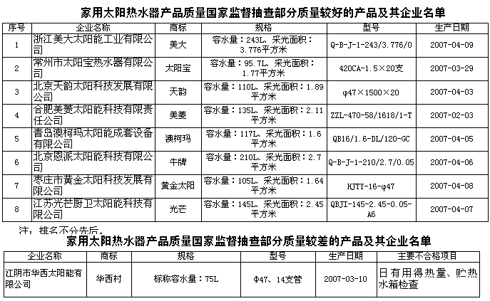 家用太陽(yáng)熱水器是由太陽(yáng)集熱器、貯熱水箱、管道及控制器等組成的節(jié)能產(chǎn)品,產(chǎn)品類(lèi)型主要分為真空管型、平板型和悶曬型。據(jù)統(tǒng)計(jì),2006年全國(guó)已有家用太陽(yáng)熱水器生產(chǎn)企業(yè)五千多家,總產(chǎn)量達(dá)到2000萬(wàn)平方米。 為維護(hù)消費(fèi)者的合法權(quán)益,促進(jìn)家用太陽(yáng)熱水器行業(yè)健康發(fā)展,國(guó)家質(zhì)檢總局組織對(duì)家用太陽(yáng)熱水器產(chǎn)品質(zhì)量進(jìn)行了國(guó)家監(jiān)督抽查。共抽查了北京、河北、江蘇、浙江、安徽、山東、湖北、廣東等8個(gè)省、直轄市40家企業(yè)生產(chǎn)的40種產(chǎn)品(不涉及出口),產(chǎn)品抽樣合格率為82.5%。 此次抽查依據(jù)強(qiáng)制性國(guó)家標(biāo)準(zhǔn)GB4706.1-1998《家用和類(lèi)似用途電器的安全第一部分