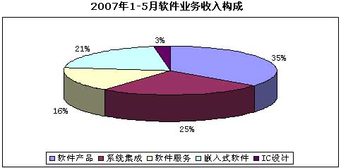 全行業(yè)虧損面有所縮小,1-5月虧損企業(yè)個(gè)數(shù)同比增長(zhǎng)4.8%,比1-2月增幅下降1個(gè)百分點(diǎn);虧損企業(yè)虧損額145億元,比1-2月下降1.8個(gè)百分點(diǎn),其中國(guó)有控股企業(yè)表現(xiàn)較好,虧損額同比下降24.3個(gè)百分點(diǎn)。分經(jīng)濟(jì)類型看,內(nèi)資企業(yè)累計(jì)虧損34.2億元,同比下降20個(gè)百分點(diǎn);三資企業(yè)累計(jì)虧損110.4億元,比去年增虧21.4億元。 3.高端產(chǎn)品發(fā)展較快,傳統(tǒng)家電產(chǎn)品有所萎縮。從我部重點(diǎn)監(jiān)測(cè)產(chǎn)品情況看,移動(dòng)通信手機(jī)、液晶電視、筆記本電腦、液晶顯示器等產(chǎn)品連續(xù)幾個(gè)月保持30%以上增速。1-5月全行業(yè)共生產(chǎn)手機(jī)22598.9萬(wàn)部,同比增長(zhǎng)33.7%;筆記本電腦產(chǎn)量比重不斷提高,全行業(yè)共生產(chǎn)微型計(jì)算機(jī)4875.3萬(wàn)部,其中筆記本3055.5萬(wàn)部,占微機(jī)比重為63%,比去年提高3個(gè)百分點(diǎn);高端彩電產(chǎn)品發(fā)展迅速,特別是液晶電視共生產(chǎn)486.6萬(wàn)臺(tái),同比增長(zhǎng)66.2%,占彩電的比重達(dá)到17%,比去年同期提高7個(gè)百分點(diǎn),比上月提高2個(gè)百分點(diǎn)。傳統(tǒng)家電產(chǎn)品呈負(fù)增長(zhǎng)態(tài)勢(shì),電話單機(jī)生產(chǎn)量同比下降8%;傳真機(jī)同比下降26.8%。集成電路增速有所放緩,1-5月共生產(chǎn)155.5億塊,同比增長(zhǎng)12.5%,較上年同期增速下降37.1個(gè)百分點(diǎn)。 4.軟件業(yè)繼續(xù)保持平穩(wěn)發(fā)展,內(nèi)部結(jié)構(gòu)調(diào)整進(jìn)一步深化。1-5月軟件業(yè)實(shí)現(xiàn)收入1846.0億元,同比增長(zhǎng)27.0%,占電子信息產(chǎn)業(yè)比重仍然保持在10%以上。從其內(nèi)部構(gòu)成看,軟件服務(wù)業(yè)繼續(xù)保持較快發(fā)展水平,高出軟件業(yè)平均增速10個(gè)百分點(diǎn);IC設(shè)計(jì)收入增速較年初有所放緩,但仍高出平均增速水平。1-5月軟件產(chǎn)品實(shí)現(xiàn)收入658.8億元,同比增長(zhǎng)26.2%;系統(tǒng)集成456.5億元,同比增長(zhǎng)25.8%;軟件技術(shù)服務(wù)303.1億元,同比增長(zhǎng)37.0%;嵌入式系統(tǒng)軟件收入380.0億元,同比增長(zhǎng)20.0%;IC設(shè)計(jì)收入47.6億元,同比增長(zhǎng)33.3%,上述五大類業(yè)務(wù)收入構(gòu)成36:25:16:20:3個(gè)格局,與1-2月份的39:27:17:15:2的格局有所調(diào)整。