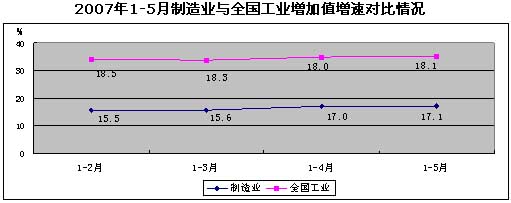 制造業(yè)發(fā)展速度有所放緩。今年自年初以來(lái),制造業(yè)實(shí)現(xiàn)主營(yíng)業(yè)務(wù)收入、增加值增速保持在15.5%-17.1%區(qū)間內(nèi)小幅震蕩,增速水平比去年同期增速低近15個(gè)百分點(diǎn)。制造業(yè)增加值增速連續(xù)低于全國(guó)工業(yè)增速水平,1-5月增加值增速低于全國(guó)工業(yè)增加值增速1.2個(gè)百分點(diǎn)(全國(guó)工業(yè)增速為18.1%)。