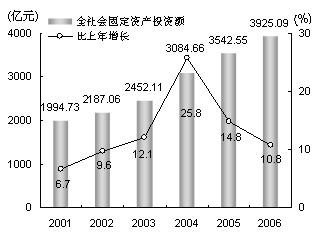 增長19.5%;營業(yè)稅558.67億元,增長8.9%;個人所得稅131.07億元,增長17.1%;房產(chǎn)稅42.68億元,增長25.1%。全年地方財(cái)政支出1813.8億元,比上年增長9.2%。其中,基本建設(shè)支出395.58億元,增長7.1%;科教文衛(wèi)事業(yè)支出316.12億元,增長13.9%;企業(yè)挖潛改造資金支出251.99億元,增長5.9%。 固定資產(chǎn)投資增幅回落。全年完成全社會固定資產(chǎn)投資總額3925.09億元,比上年增長10.8%,增幅比上年回落4個百分點(diǎn)(見圖2)。其中建設(shè)改造投資2246.93億元,增長13.2%。投資結(jié)構(gòu)進(jìn)一步優(yōu)化。從產(chǎn)業(yè)投向看,第一產(chǎn)業(yè)投資14.29億元,比上年增長1.6倍,占全社會固定資產(chǎn)投資總額的比重為0.4%;第二產(chǎn)業(yè)投資1212.71億元,增長12.1%,所占比重為30.9%;第三產(chǎn)業(yè)投資2698.09億元,增長9.9%,所占比重為68.7%。從投資主體看,國有經(jīng)濟(jì)投資1460.09億元,比上年增長17.7%,占全社會固定資產(chǎn)投資總額的比重為37.2%;集體經(jīng)濟(jì)投資159.31億元,增長21.6%,所占比重為4.1%;股份制經(jīng)濟(jì)投資910.31億元,下降0.7%,所占比重為23.2%;外商及港澳臺投資725.85億元,增長13.4%,所占比重為18.5%。