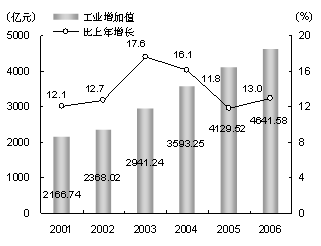 食用農(nóng)產(chǎn)品安全性進(jìn)一步提高。已認(rèn)證無公害農(nóng)產(chǎn)品、安全衛(wèi)生優(yōu)質(zhì)農(nóng)產(chǎn)品、有機(jī)食品和綠色食品356個,形成品牌農(nóng)產(chǎn)品100多個。加快推進(jìn)有機(jī)農(nóng)業(yè)發(fā)展,全年有機(jī)肥推廣使用面積5.33萬公頃,綠肥種植面積2.19萬公頃。 農(nóng)業(yè)基礎(chǔ)設(shè)施進(jìn)一步完善。全年市區(qū)兩級政府農(nóng)業(yè)投入達(dá)到45億元,比上年增長17%。至年末,全市建成5.53萬公頃設(shè)施糧田、0.67萬公頃設(shè)施菜田。建成農(nóng)業(yè)標(biāo)準(zhǔn)化示范區(qū)(場)203個,其中國家級37個。農(nóng)業(yè)組織化程度繼續(xù)提高。全市有12個市級現(xiàn)代農(nóng)業(yè)園區(qū);有農(nóng)業(yè)產(chǎn)業(yè)化龍頭企業(yè)425家,農(nóng)業(yè)專業(yè)合作社510家,帶動農(nóng)戶52萬戶。 三、工業(yè)和建筑業(yè) 工業(yè)生產(chǎn)保持快速增長。全年實(shí)現(xiàn)工業(yè)增加值4641.58億元,比上年增長13%(見圖3)。其中規(guī)模以上工業(yè)增加值4456.04億元,增長13.4%。在規(guī)模以上工業(yè)增加值中,輕工業(yè)增加值1223.64億元,增長6.4%;重工業(yè)增加值3232.4億元,增長16.3%。全年工業(yè)總產(chǎn)值19631.23億元,比上年增長13.9%,其中規(guī)模以上工業(yè)總產(chǎn)值18316.23億元,增長14.7%。