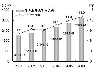 商業(yè)布局與結(jié)構(gòu)調(diào)整步伐加快,市場流通規(guī)模繼續(xù)擴(kuò)大。全年批發(fā)和零售業(yè)實(shí)現(xiàn)增加值919.43億元,比上年增長9.1%。 消費(fèi)品市場銷售活躍。全年實(shí)現(xiàn)社會消費(fèi)品零售總額3360.41億元,比上年增長13%,增幅創(chuàng)1998年以來最高(見圖5)。其中,吃的商品零售額1328.3億元,增長13.3%;穿的商品零售額425.7億元,增長11.6%;用的商品零售額1566.55億元,增長12.8%。餐飲業(yè)、家居和通訊類商品全面增長。全年餐飲業(yè)實(shí)現(xiàn)零售額452.16億元,比上年增長29%;家居類商品實(shí)現(xiàn)零售額393.2億元,增長15.3%;通訊類商品實(shí)現(xiàn)零售額92億元,增長17.9%。主要耐用消費(fèi)品銷售穩(wěn)步增長。全年汽車零售量9.6萬輛,比上年增長5.3%,其中轎車8.8萬輛,增長5.7%;移動電話230.29萬部,增長23.5%;攝像機(jī)6.55萬臺,增長9.4%;脫排油煙機(jī)39.18萬臺,增長12.5%。