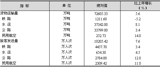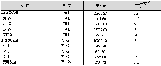 交通運(yùn)輸、倉儲和郵政業(yè)發(fā)展不斷加快。全年實(shí)現(xiàn)交通運(yùn)輸、倉儲和郵政業(yè)增加值683.61億元,比上年增長13.8%。 客貨運(yùn)輸全面增長。全年各種運(yùn)輸方式完成貨物運(yùn)輸總量72605.33萬噸,比上年增長5.6%。旅客發(fā)送總量10205.42萬人次,增長7.6%(見表4)。