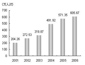 旅游環(huán)境不斷優(yōu)化,服務(wù)水平繼續(xù)提高。全年實(shí)現(xiàn)旅游產(chǎn)業(yè)增加值695.06億元,比上年增長17.8%。 旅游基礎(chǔ)設(shè)施日趨完善。至年末,全市星級賓館已達(dá)317家,其中五星級賓館26家。全市已有旅行社879家。其中,國際旅行社53家,國內(nèi)旅行社826家。旅游入境人數(shù)穩(wěn)步增長。全年接待國際旅游入境人數(shù)605.67萬人次,比上年增長6%(見圖6)。其中,入境外國人485.4萬人次,增長7.3%;港、澳、臺同胞120.27萬人次,增長1%。在國際旅游入境人數(shù)中,過夜旅游人數(shù)464.63萬人次,比上年增長4.5%。國際旅游外匯收入39.61億美元,比上年增長9.8%。全年接待國內(nèi)旅游者9683.97萬人次,比上年增長7.5%,其中外省市來滬旅游者7326.64萬人次,增長7.7%。國內(nèi)旅游收入1419.94億元,比上年增長8.5%。