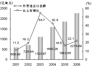 上海口岸環(huán)境進(jìn)一步優(yōu)化。全年上海口岸進(jìn)出口商品總額4287.54億美元,比上年增長22.3%。其中,進(jìn)口總額1621.89億美元,增長17.3%;出口總額2665.65億美元,增長25.5%。 外貿(mào)進(jìn)出口保持快速增長。全年外貿(mào)進(jìn)出口總額2274.89億美元,比上年增長22.1%(見圖8)。其中,進(jìn)口總額1139.16億美元,增長19.1%;出口總額1135.73億美元,增長25.2%。私營企業(yè)出口保持較快增長。全年私營企業(yè)完成出口115.58億美元,比上年增長54.3%;外商及港澳臺投資企業(yè)出口759.35億美元,增長23.3%;國有企業(yè)出口248.74億美元,增長20.3%;集體企業(yè)出口12.02億美元,增長23.8%。