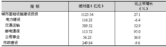 樞紐型、功能性、網(wǎng)絡(luò)化的城市基礎(chǔ)設(shè)施建設(shè)加快推進(jìn)。全年完成城市基礎(chǔ)設(shè)施建設(shè)投資1125.54億元,比上年增長27.1%,占全社會固定資產(chǎn)投資總額的比重為28.7%。其中,交通運(yùn)輸郵電通信投資703.24億元,市政建設(shè)投資249.84億元,公用事業(yè)投資56.23億元(見表9)。年內(nèi)鐵路上海南站、中環(huán)線浦西段等一批重大城市基礎(chǔ)設(shè)施項(xiàng)目相繼建成并投入運(yùn)營。浦東國際機(jī)場擴(kuò)建工程、上海長江隧橋工程和一批黃浦江越江通道、高速公路等項(xiàng)目加快建設(shè)。全市高速公路網(wǎng)通車?yán)锍踢_(dá)到581公里。