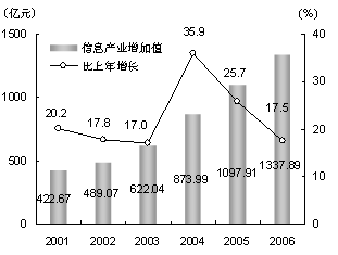 信息產(chǎn)業(yè)繼續(xù)保持平穩(wěn)發(fā)展。全年實(shí)現(xiàn)信息產(chǎn)業(yè)增加值1337.89億元,比上年增長17.5%(見圖9)。其中,信息產(chǎn)品制造業(yè)增加值813.43億元,增長17.2%;信息產(chǎn)品銷售業(yè)增加值24.91億元,增長14.9%;信息服務(wù)業(yè)增加值499.55億元,增長18.1%。全市用于信息化建設(shè)的固定資產(chǎn)投資296.25億元,占全社會固定資產(chǎn)投資總額的比重為7.5%。
