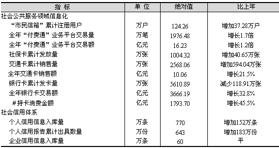 信息技術(shù)應(yīng)用向廣度和深度拓展。政府信息公開內(nèi)容進(jìn)一步深化。全年政府部門主動公開信息4.88萬條,依申請公開信息目錄1.18萬條,收到政府信息公開申請7533件,同意公開和部分公開率達(dá)到79.4%。電子政務(wù)網(wǎng)絡(luò)加快建設(shè)。全年“中國上!遍T戶網(wǎng)站主頁訪問量達(dá)2093.46萬人次,實(shí)現(xiàn)網(wǎng)上辦事和服務(wù)1671項(xiàng)。電子口岸平臺功能進(jìn)一步完善,全年電子口岸平臺的企業(yè)電子支付金額達(dá)650億元,比上年增長35.4%。全年完成電子商務(wù)交易額1899.65億元,比上年增長17%。數(shù)字證書累計(jì)發(fā)放71.8萬張。信息化發(fā)展環(huán)境日益優(yōu)化。全市累計(jì)有406.3萬人次的市民參加了計(jì)算機(jī)應(yīng)用能力等級考核,其中188萬人次取得合格證書。 信息基礎(chǔ)設(shè)施服務(wù)能力不斷提升。至年末,集約化信息管線累計(jì)敷設(shè)2451溝公里,比上年末增加830溝公里;互聯(lián)網(wǎng)用戶達(dá)到957萬戶,增加154萬戶;寬帶接入用戶335.2萬戶,增加87.8萬戶;有線電視用戶達(dá)到448.12萬戶,增加20.82萬戶,其中有線電視雙向改造完成200.3萬戶,增加14.64萬戶;衛(wèi)星站點(diǎn)831個,比上年末減少84個。 社會公共服務(wù)領(lǐng)域信息化程度進(jìn)一步提高,社會信用體系不斷完善(見表11)。