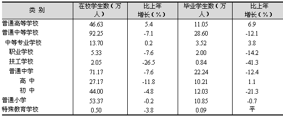 加快高校學(xué)科布局和專業(yè)結(jié)構(gòu)調(diào)整,深化教育綜合改革。至年末,全市共有普通高等學(xué)校60所;普通中等學(xué)校945所;普通小學(xué)626所;特殊教育學(xué)校28所。普通高校在校生和畢業(yè)生數(shù)持續(xù)擴(kuò)大,中等學(xué)校和小學(xué)生在校生和畢業(yè)生數(shù)繼續(xù)下降(見表12)。全市義務(wù)教育階段公辦學(xué)校學(xué)雜費(fèi)全部免除,受益學(xué)生達(dá)到85.1萬人。享受高校幫困獎學(xué)金的大學(xué)生4.59萬人;實(shí)施中等職業(yè)教育幫困助學(xué)和專業(yè)獎勵辦法,減免和獎勵2.5萬余名中職學(xué)生的學(xué)費(fèi)。