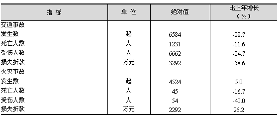 環(huán)境保護(hù)取得積極成效。全年用于環(huán)境保護(hù)的資金投入310.85億元,相當(dāng)于全市生產(chǎn)總值的比例達(dá)到3.02%。主要污染物排放總量得到控制,全年空氣質(zhì)量優(yōu)良天數(shù)達(dá)324天,環(huán)境空氣質(zhì)量優(yōu)良率達(dá)到88.8%。全市區(qū)域月降塵平均值為8噸/平方公里,比上年下降9.1%。全年建成37.34平方公里“無燃煤區(qū)”。污水處理能力達(dá)到487.9萬噸/日,比上年增加16.9萬噸/日;城市污水集中處理率達(dá)到71%。全年新增生活垃圾無害化處理能力600噸/日。 城市綠化建設(shè)全面推進(jìn)。全年新建綠地1691公頃,其中公共綠地808公頃。年內(nèi)相繼建成炮臺灣濕地公園(一期)、濱江森林公園(一期)、北外灘(置陽段)等一批大型公共綠地。全年新建居住區(qū)綠地473公頃。至年末,城市綠化覆蓋率達(dá)到37.3%,人均公共綠地面積達(dá)到11.5平方米。至年末,全市有125座城市公園實(shí)行免費(fèi)開放。林業(yè)建設(shè)平穩(wěn)發(fā)展,年內(nèi)新增造林面積4394公頃,其中防護(hù)林3863公頃。森林覆蓋率達(dá)到11.6%。 安全生產(chǎn)事故下降。全年本市各類安全生產(chǎn)事故死亡1799人,比上年下降11.4%。其中,工礦商貿(mào)生產(chǎn)安全事故死亡397人,下降3.9%;道路交通事故6584起,造成1231人死亡、6662人受傷,直接財(cái)產(chǎn)損失3292萬元;火災(zāi)事故4524起,造成45人死亡、54人受傷,直接財(cái)產(chǎn)損失2292萬元(見表14)。全年億元GDP安全生產(chǎn)事故死亡人數(shù)為0.175人,下降21.2%。