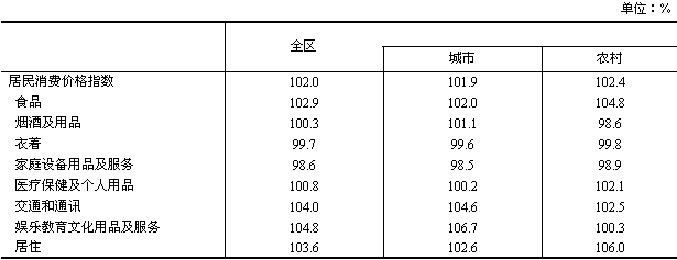 在限額以上批發(fā)和零售業(yè)中,服裝鞋帽針紡織品類零售額增長33.0%,石油制品類零售額增長17.3%,汽車類零售額增長72.9%,金銀珠寶類零售額增長24.0%,家用電器和音像器材類零售額增長14.6%。 全區(qū)居民消費(fèi)價(jià)格總水平比上年上漲2.0%。其中:城市上漲1.9%,農(nóng)村上漲2.4%。服務(wù)項(xiàng)目價(jià)格上漲5.0%;消費(fèi)品價(jià)格上漲1.5%。在各類消費(fèi)品中,娛樂教育文化用品及服務(wù)、交通通訊、居住類和食品類價(jià)格上漲幅度較大,分別上漲了4.8%、4.0%、3.6%和2.9%,其他各類價(jià)格略有上漲或下降。 商品零售價(jià)格上漲0.2%;農(nóng)業(yè)生產(chǎn)資料價(jià)格上漲0.4%;農(nóng)產(chǎn)品收購價(jià)格上漲3.3%;工業(yè)品出廠價(jià)格上漲6.0%。