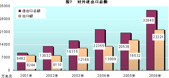 全年進(jìn)出口總額達(dá)3.28億美元,比上年增長59.9%。其中:出口總額2.22億美元,增長34.4%;進(jìn)口總額1.06億美元,增長1.7倍。