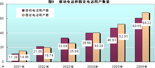 用戶3.25萬戶。新增移動電話交換機(jī)14.00萬門,總?cè)萘窟_(dá)80.00萬門。新增移動電話用戶13.62萬戶,達(dá)到了60.55萬戶。年末全區(qū)固定及移動電話用戶總數(shù)達(dá)到128.77萬戶,比上年末增加29.29萬戶。電話普及率達(dá)到46.5部/百人。